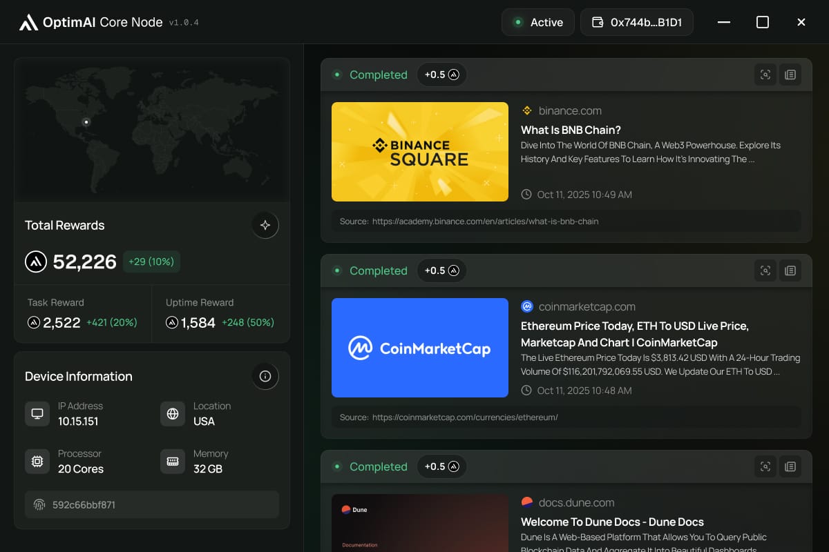 Every Core Node you run helps expand the OptimAI Network’s reach, speed, and intelligence -powering data crawling, embeddings, and AI compute directly from your machine.