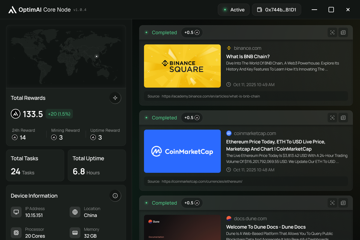Unlike typical blockchain nodes that merely validate transactions, OptimAI Core Nodes perform active, intelligent work around the clock: